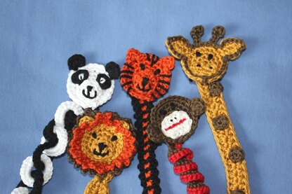 This pattern set includes 5 adorable patterns for soother clips ~ giraffe, lion, monkey, tiger and panda.