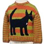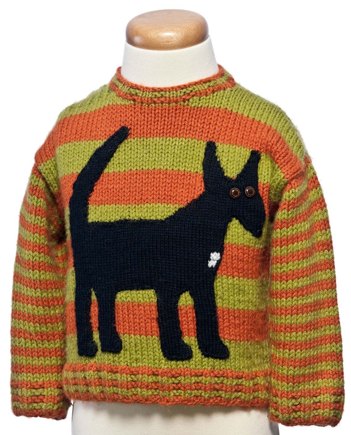 My friends Sarah and Robb are dog lovers like me. So when I found out they were going to have a baby, I thought a dog sweater would be the perfect gift. The dog on the sweater is Ella, their sweet but skittish girl who is black with a white spot on her chest. When Forrest was born, Ella sent out the birth announcements! Ella is knit separately and sewn on,