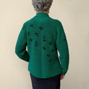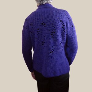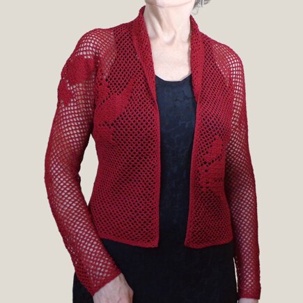 This pattern gives the option of calculating your stitches and rows to suit your own gauge and measurements, or alternatively, choosing a collar chart for your size (with prescribed stitches and rows) and determining the length of the yolk and body by fitting it as you go. The latter method suits people with normal tension, and that's how I made this jacket. I added the butterflies.
