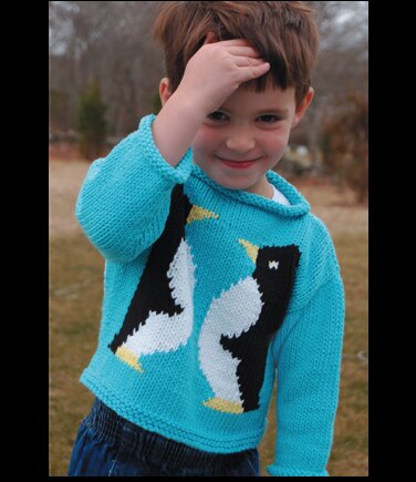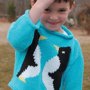 Penguins, a perennial favorite, are on this front and back of this sweater, and it has a wide boat neck so that it is easy to pull on and off.