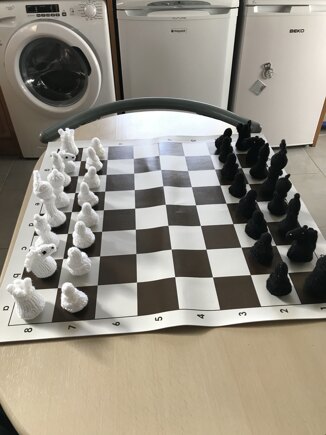 I was asked if I could make a chess set that would be suitable for people with specific behaviours so as they would be totaly soft so as not to cause harm if thrown. I found a pattern off the internet and made changes so each figure was knitted in one piece where possible and there was no solid base inserted. It proved to be the most tedious thing I have done so I decided to buy a vinyl chess board and not knit one.