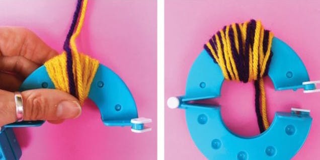 Tie a tight single knot and then wind the yarn back around the makers and tie a tight double knot to secure the pom.