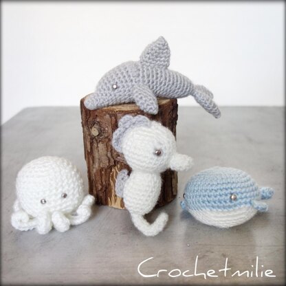 4 animal patterns included: Whale/Seahorse/Dolphin/Octopus They would be awesome for a baby mobile! They can be a cute gift for kids too! **PDF instant download** Pattern written in standard US terms. It includes many pictures to help explain Skill level: Easy MATERIALS - 2.75 mm (C) hook (You can take a larger or smaller crochet if you want a different size) - Light worsted weight [3 or 4] yarn (I used Caron simply soft in blue for the whale, Soft white Patons yarn and Snuggly Wuggly yarn in Gray) - Tapestry needle for sewing and weaving in ends - Scissors - Stitch Marker - Polyester Stuffing - Eyes : 3 options : Safety 6 mm black eyes / 4 mm metal round studs/ Super-fine black yarn --You cannot sell or reproduce this pattern, but you are welcome to sell the finished product made from it.