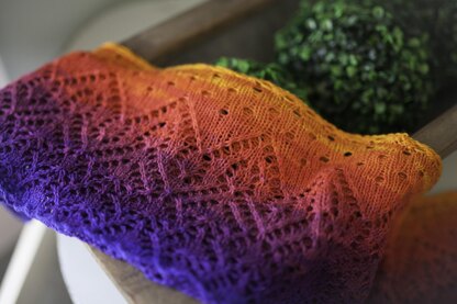 10 Yards A Day was originally a mystery knitalong, using the gorgeous colors of FiberOptic Paintbox Gradients. Worked from the top down in the round, it will has a kind of trapezoid shape to it, but will be long and generous to wrap around your neck two, count ‘em, two times!
