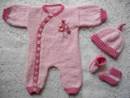 Instructions for a reborn or baby side buttoning romper suit in dk yarn. The set comprises of a romper suit with a knitted in tree motif, pull on hat and pull on bootees. When knitted, this set will fit a newborn baby upto 5-6lb or an 18 inch reborn doll. You will need 150g of Patons Fairytale Velvet DK or Jarol Ruffles, and 100g of 100% cotton yarn, 3.25mm needles, 4mm needles, 3 stitch holders, 14 buttons, and a few odd ribbon roses to complete.