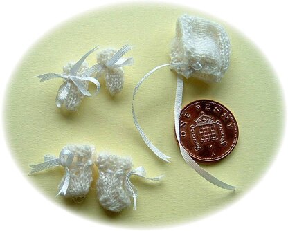 1:12th scale baby set-bonnet, mittens and bootees for a dolls house baby doll.