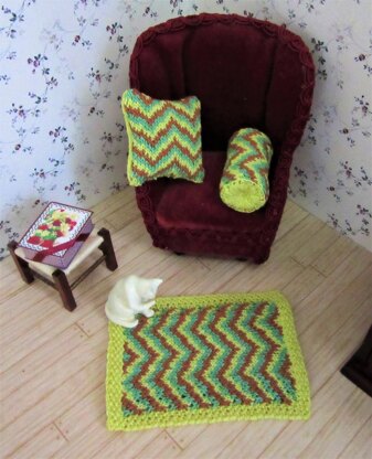 Approximate finished sizes: Rug - 7.5 cm/3-inches x 5.5 cm/2¼-inches Square cushion - 3 cm/1¼-inches square Bolster cushion - 4 cm/1½-inches long x 1.25 cm/½-inch diameter