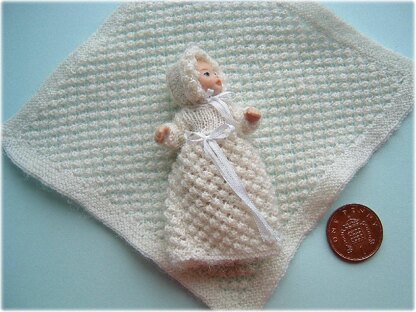 Approx finished sizes: Dress 6 cm high x 2 cm wide at chest, Shawl 12.5 cm square, Bonnet - 1.25 cm tall.