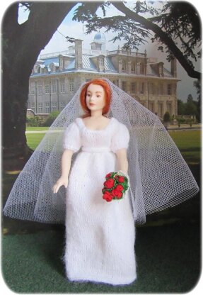 Finished sizes: Neck to hem (at front) - 4-inches/10 cm; Note: short train adds ¾-inch/2 cm to back length. Hem width (front of dress with short train) – 4-inches/10 cm; hem width (front of dress with high waist) – 2-inches/5 cm; waist - 1-inch/2.5 cm. Sleeve lengths - short - ¾-inch/2 cm; elbow length – 1¼-inch/3 cm.