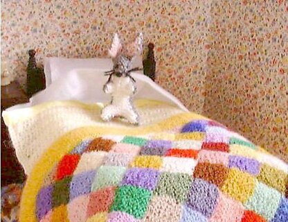 Finished sizes: Bedspread: 6 x 7½-inches/ 15 x 19 cm approx. Blanket: 5½-inches x 6½-inches/ 13.75 x 16.25 cm approx. Rabbit: 1½-inches/4 cm tall.