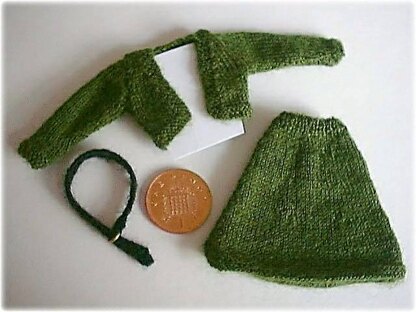 Materials required: Skirt - One pair size 19 (1 mm/US size 5/0) knitting needles, 25 metres/28 yards 1-ply wool. Bolero - One pair size 19 (1 mm/US size 5/0) knitting needles, 25 metres/28 yards 1-ply wool. Belt - One pair size 19 (1 mm/US size 5/0) knitting needles, small amount of wool, small ring or buckle.