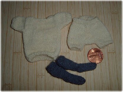 Finished sizes: Vest – 5 cm/2-inches neck to hem, 4 cm/1½-inches across chest, sleeve length 2 cm/¾-inches. Y-fronts – 3 cm/1¼-inches at waist, 4 cm/1½-inches waist to leg hem. Socks - foot length 2.5 cm/1-inch, 3 cm/1¼-inches top to heel.
