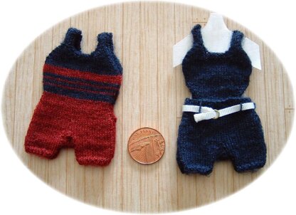 Materials Required: Swimming Suit - Size 19 (I mm/US size 00000) knitting needles, 25 metres/28 yards 1-ply yarn in main colour, 12.5 metres/14 yards 1-ply yarn in contrast colour, small safety pins or stitch holders. Swimming Costume with Removable top - Size 19 (I mm/US size 00000) knitting needles, 37.5 metres/42 yards 1-ply yarn, 10 cm/4-inch length 2 mm/⅛-inch ribbon (for belt), small buckle or 3 mm ring (jewellery findings are ideal), 3 miniature buttons or beads.