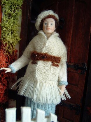 Materials required: Tammy - size 21 (0.8 mm) knitting needles, 6 yards/5 metres 1-ply wool in dark colour, 28 yards/25 metres 1-ply wool in light colour. Scarf - size 19 (1.00 mm/US size 5/0) knitting needles, size 21 (0.8 mm) knitting needles, 55 yards/50 metres light coloured 1-ply wool, 12 yards/10 metres dark coloured 1-ply wool, 2 buttons or beads for belt.