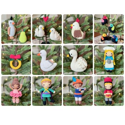 The 12 Days of Christmas collection gives you all the instructions and photographs you'll need to crochet your own beautiful, heirloom-quality set of ornaments matching the traditional 12 Days of Christmas song. When you make this set, you are making something memorable that the whole family will take out and enjoy year after year. The 12 Days of Christmas ornaments are my original amigurumi design. Your purchase comes as a PDF file with 56 pages of written instructions and a photo tutorial for each ornament shown here. You will receive directions for crocheting all figures pictured.