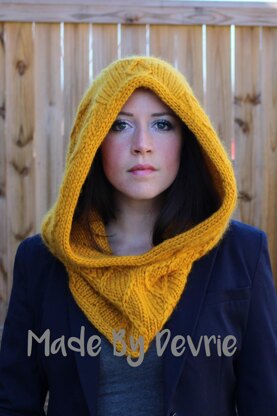 Hoods are a perfect accessory for the cold weather months. It can be worn as a cowl or a hood and can go with many styles of coats or jackets. Because this hood is knit with chunky yarn, it knits up quicker than most hoods. The knit cables on the stockinette background adds a unique touch to the hood