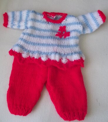 This pattern is knitted in DK yarn, with easy to follow instructions for a complete wardrobe of clothes to fit an average 14" (36cms) doll.