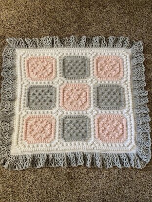 This baby blanket was made with I Love This Yarn: Pink: 800 yards White: 1100 yards Grey: 1100 yards
