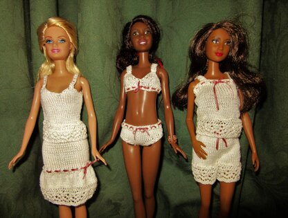 Camisole top: 5.5 cm/2-¼-inches top to bottom;chest –6 cm/2½ -inches across; Knickers/shorts – 5 cm/2-inches at waist; sides seam (shorts) 3 cm/1¼-inches; side seam (knickers) 5.5 cm/2-¼-inches; Panties – 5 cm/2-inches across top; 3.5 cm/1¼-inches top to crotch. Bra - 5 cm/2-inches around under bust; Vest – side seam 5 cm/2-inches; chest 5 cm/2-¼-inches. Petticoat/skirt - 9.5 cm/3¾-inches long; 5 cm/2-inches at waist
