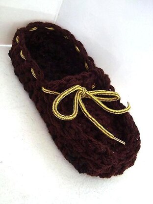 A great, moccasin type slipper, which you can make with a very sturdy sole, if you slip felt soles inside! (The type used to put inside boots.)