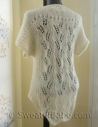 The result: – a high low hem, almost like the elegant coat tails of long ago -- gently shaped, short dolman sleeves with a bit of a turned back cuff -- front curved and open neckline to allow for fabulous jewelry -- farrow ribbing to accentuate the vertical, slimming lines of the lace and create a contrasting texture.