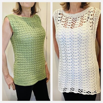 Two great looking tunics in one pattern! Both easy to make, but with a not so easy appearance....now THAT'S what we like don't we :slightly_smiling_face: Wonderful to wear with a pair of jeans, or one of them would even be very suitable to wear to the beach as a beach cover up. Simple pattern for ALL SKILL LEVELS and in the sizes small, medium, large and x-large. Both easy to adjust to bigger or smaller sizes, esspecially the green tunic, since it's made sideways; all you have to do is add or subtract rows to get that perfect custom made fit!