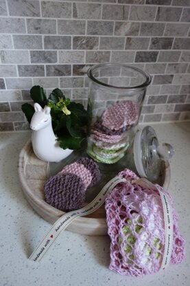 The face pads are completely reusable, eco friendly and perfect for everyday use. Once they get dirty, toss them in the laundry bag and just throw the whole thing in the wash, so that will stay together in one place. The pattern includes instruction for full set, including two knit pad designs and one adjustable size, mesh laundry bag. Make this spa set for you or as a lovely gift for friends and family!