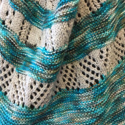 This is a big shawl, it is good to have a nice contrast between the two yarns. I used Cascade 220 Superwash Worsted in a light grey and Madeline Tosh's Tosh DK in turquoise, grey, etc (col