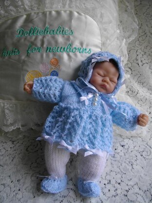 Instructions for a reborn's front fastening short dress, bonnet, leggings and shoes in 4ply yarn. When knitted this set will fit a 10 inch reborn doll. You will need 50g main colour 4ply yarn, 20g contrast colour, 3.25mm needles, 3 buttons, ribbon for bonnet and embellishments to complete.