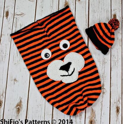 Sizes 3: preemie 0 - 3 months, 3 - 6 months Materials: UK-DK, USA-Light Worsted (3), AU-8ply Cocoon Orange- 67g, 85g, 125g Black- 77g, 85g, 110g Chin and cheeks and eyes White-6g, 20g, 24g Mouth-black scrap Hat Orange-20g, 22g, 24g Black-25g, 27g, 30g 2 x 23mm black buttons for eyes Knitting needles 3.75mm