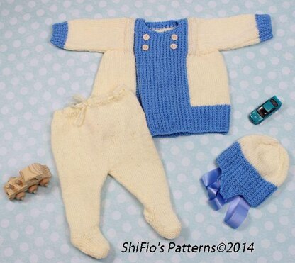 Main double knitting 130g Contrast double knitting 70g Knitting needles 3.75mm Medium sized buttons 6 Ribbon for hat 1” (2.5cm) wide 38” (96cm)