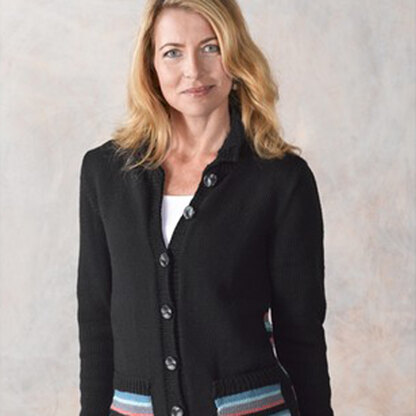 The colourful stripes on the back of this cardigan add beauty to this simple jumper. The stripes are only on the back, so you don't have to worry about matching them to the front, and the pockets add a great detail too! This cardigan is knit flat in pieces from the bottom up and seamed.