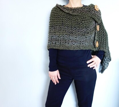This wrap inspired by nature is gorgeous and warm. The asymmetrical rolled collar surprises and delights for a unique and dramatic look. It covers but still shows off the waist and hips. Designed for bulky yarn, this poncho is worked flat , quick and easy to make, perfect pattern for a beginner knitter.
