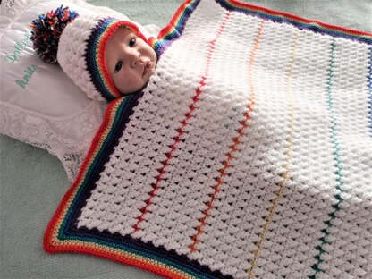 Instructions for a rainbow coloured crochet blanket. The pattern contains a video link with thanks to Dabbles and Babbles showing you how to do this pattern, as well as written instructions. The finished blanket is approximately 31 inches by 28 inches, and the beanie hat will fit a 0-3 month baby or 20-22" reborn doll.