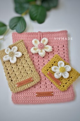 covers, as well as the cardholder, I'm using worsted yarn. However, for the daisy flowers on the phone bag and cardholder, I'm using DK yarn to create smaller flowers.