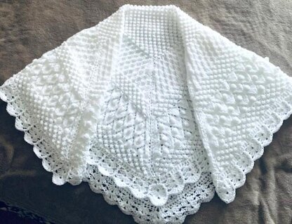The finished size is approx 42x42ins/107x107cms. Perfect for a shawl or indeed a receiving blanket. Baby can use this for some time to come if needed.