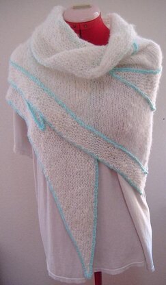 It is a one piece, top-down, symmetrical, triangle shawl. Cast-on 300 stitches and decrease at both sides. First and third triangles are in garter stitch. Second triangle is in stockingnett stitch. I crocheted slip stitch to outline the 3 triangles and at the same time add texture, structure and weight to the mohair mix yarn shawl. Any yarn and colour will be great for it. Gauge is unimportant.