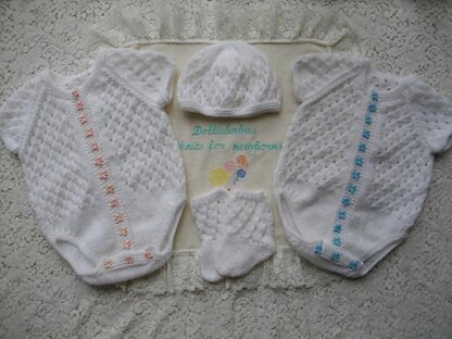 Instructions for a baby's vest set in DK yarn. The set comprises of a button up and under vest, beanie hat and socks in a lacy eyelet pattern. When knitted this set will fit a 3-6 month old baby.