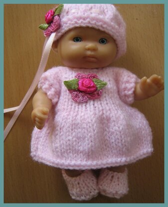 Easy to make dress set for 5" Berenguer doll. Instructions are for dress, hat, panties and shoes. Knitted with 2.25mm straight needles and 4 ply yarn. Outfit also uses 4mm buttons to fasten the dress and ribbon for the hat. Uses about 25g of yarn or less.