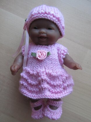 Hand knitting pattern for 5" Berenguer doll using 4 ply yarn and 2.25mm needles. Instructions for dress, hat, panties and shoes. You will also need 3mm ribbon, 2 X 4mm buttons and decorations for the dress, hat and shoes.