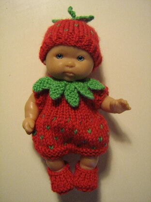 Lovely little strawberry outfit for your 5" Berenguer doll with very easy 2 colour work to the lower half and on the hat. Instructions are given to make the romper suit, hat and shoes and also the leaves to decorate the outfit. An ambitious beginner could make this outfit.