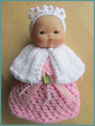 Cute Princess outfit for the 5" Berenguer doll. Instructions are for dress, cape, tiara, panties and shoes.