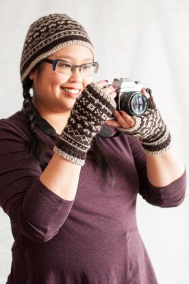 This simple hat and handwarmer set is perfect for practicing your stranded colourwork. The pattern is comprised entirely of peeries, which are small colourwork repeats of 1-7 rounds. To ensure the foreground pattern ‘pops’ against the background, be sure to consistently hold the contrast colour in your left hand, or with the strand coming up from under the main colour.