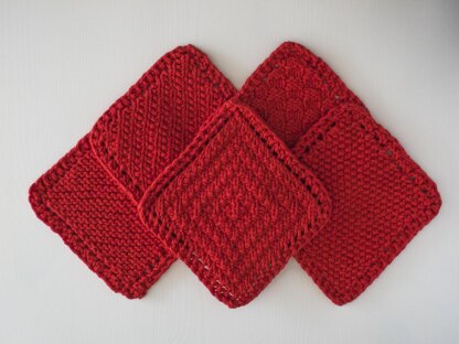 This pattern makes 5 small dishcloths on the bias, each with a different pattern: garter, seed, basketweave, mock rib, and diamond. Each dishcloth measures about 5” square, and you can make all 5 from a single, small big-box-store ball of cotton yarn!