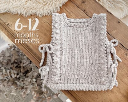 The Plumeti Vest features its elegant plumeti stitch, ruffled bobble details, a double picot edge, and a practical side-tie closure. Perfect for any occasion, this garment is not only adorable but also comfortable and easy to wear.