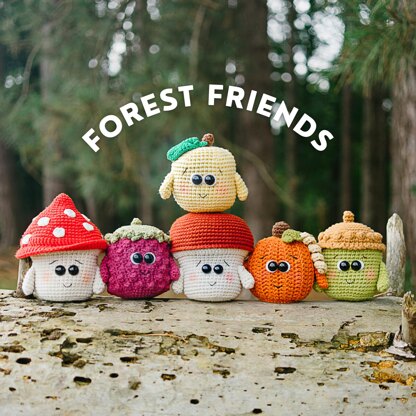 This is a crochet pattern to make the forest friends: Crochet Mushroom, Crochet Acorn, Crochet Apple, Crochet Fly Agaric, Crochet Raspberry and Crochet Pumpkin