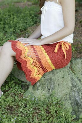 The skirt is crocheted in a cotton yarn blended with Tencel for fabulous drape and softness. The bright color combination is earthy and young, yet the A-line skirt shape makes it very elegant and sophisticated. A self-sash at the waist adds a fun accent and allows you to decide if you prefer your skirts to hit at the waist or ride a little lower on your hips. Three buttons at the side.