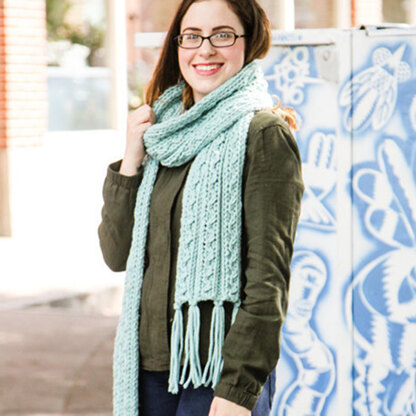 A simple cable pattern zigs and zags across Valley Yarns Ziggy Scarf by Vickie Howell. Designed especially for Valley Superwash Super Bulky, a 100% Merino machine-washable yarn, the Ziggy Scarf is quick to knit and as soft as can be. The scarf is knit from end to end seamlessly. The cable pattern is in written form only.
