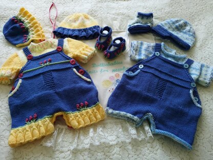 Instructions for both the boy's and girls short dungaree Set. The girls set features a bell shaped edging and knitted in flowers. Some experience is needed for the flowers. I have used Sirdar Snuggly dk for the shorts, and Pound Stretchers Wonder Knit DK for the sweaters. King Cole Splash or James C Brett's magi-knit is a good alternative yarn. I couldn't decide on which hat to do for the girls version, so there are instructions for both the bonnet and the sunhat.