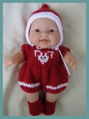 Cute romper set for your 8" Berenguer baby comprising romper suit with rabbit motif and stripes knitted in, pixie hood with ribbon ties and matching shoes. The pattern is easy to follow and knits up very quickly. If you have some knitting experience a beginner could knit this set with a bit of patience. The pattern is knitted in UK terms. One 50g ball of yarn will easily knit this set with oddments of white for the contrast. You will need 3 x 1cm buttons and 3mm ribbon for the finishing.